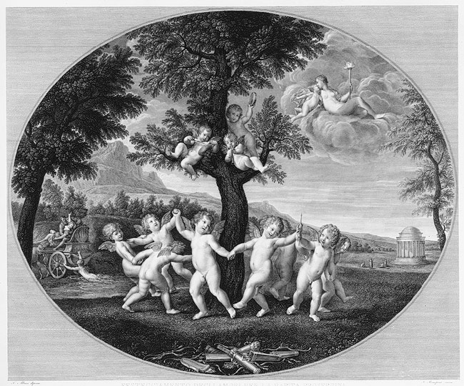 | This etching dates back to approximately 1805-1812. Francesco Rosaspina created this engraving/etching after being inspired by an oil painting by Francesco Albani. Depicted are several charibs dancing around a tree, while Cupid and Aphrodite cuddle on a cloud and Pluto rapes Proserpina in his chariot.