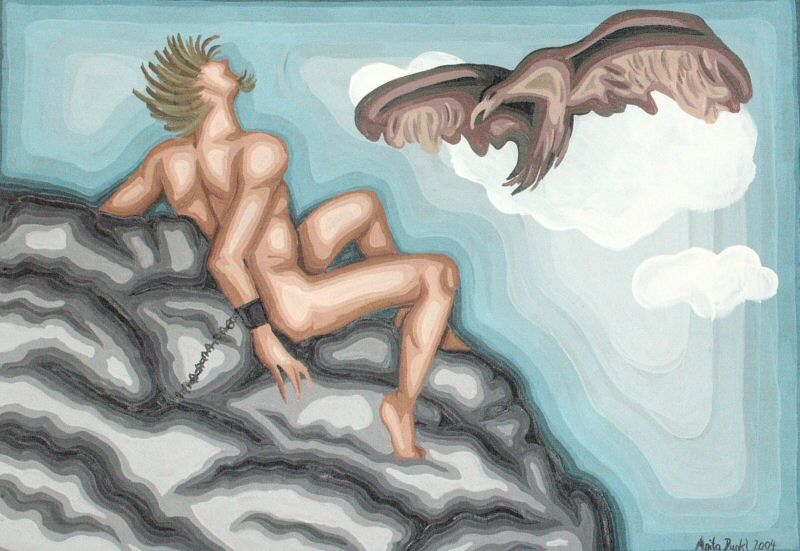 Prometheus by Anita Dunkl is an acrylic on canvas painting in 2004. Anita likes to paint and is a psychology major living in Graz. It is a modern interpretation of Prometheus being attacked by the eagle. Similar to the Rubens painting she uses diagonal lines to show action. Prometheus's hair also alludes to that worn by Einstein, showing his intelligence.