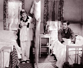 In the scene of the movie, represented by the above picture, a little song is written in for comical purposes. Peter begins to sing "Who's afraid of the big bad wolf" while Ellen changes into pajamas and refuses to talk to him while she is doing so. The song helps portray the wolf character in cartoons that drool and howl at the sight of a pretty woman as well as ridicule Miss Andrews for her naive, uppity nature. The comedy comes in because of the blanket, which seemingly restrains Peter from becoming this wolf. He is not, at this point, interested in Ellen, and is poking fun of her and the fact that she is worried about being in the company of a man. The use of background music and specific songs to enhance the story line is similar to how Aristophanes used music. In his ancient plays, Aristophanes used specific songs sung by the chorus to help portray a point in the play or situation. Music could have been played in the background by the orchestra on flutes and aulos. Menander used music as kind of an interlude, but Aristophanes' music and the specific songs in It Happened One Night reflect what is happening with the characters. It develops each scene further. Week Three. Plautus's Use of Music Plays written by Plautus were performed in ancient Rome were accompanied by the cantica (chorus/orchestra) for a large portion of the play. The style of the usage of the cantica was only bound by two general rules. Accompanied and unaccompanied scenes alternated and plays always ended with accompaniment. Others rules that he tended to follow seemed to revolve around the plot. More serious or unsympathetic characters were rarely accompanied. Scenes of great emotion were accompanied. And passages where the audience learns something important are usually unaccompanied. He would also switch back and forth between the two to marks crises in his plots. At times Plautus would use music to call attention to similar or contrasting points in the plot by repeating musical refrains. Accompaniment was also used to split portions of plays or entire plays into major units of action.