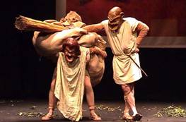 Photos obtained courtesy of http://veneziainscena.provincia.venezia.it/dyskolos_file/image010.jpg The scenery used in ancient times was a little more basic and simple than what we are capable of doing these days in the movie business. Special effects have made anything possible. One could have the setting of an entire movie on the Sun itself, and as far as the computers are concerned, it could happen. But in the ancient plays, the music, words, and costumes were the most important aspect that got the setting across. The Roman Comedies took place in a Greek town. They could not do much as far as buildings and a set goes, so the costumes were important for the illusion, the spoken word and the manner of speaking was important, as well as the music. It was these three things that helped the audiences' imagination take them to the place the play was supposed to be. Scenery for "Iran Man" Like most roman comedies, the setting of the play was a Greek town, Athens. A street was portrayed on stage, much like those used in Menander, and had two house doors. In the notes at the beginning of the text we read, it was suggested that an object was needed on the right side of the stage for characters to hide behind. Einstein, Cherry, and Fat Jack all hide behind something, and a dumpster is suggested in the notes. With the capabilities they had back then, the set was just to help add to the illusion.