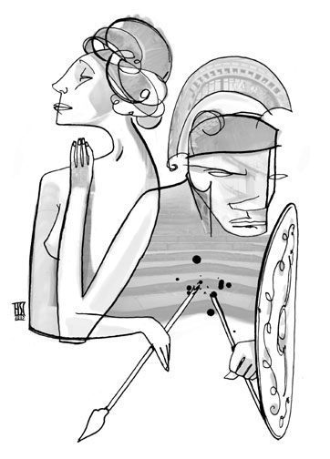 This first scene is where we begin to see the first portrayal of women, that they are deceitful beings. Lysistrata’s great plan for getting the men home is that all the women should refuse sex to their husbands. While the women refuse the plan at first Lysistrata eventually assures the women that refusing sex is the only way to make peace happen. She states, “If we sat around at home all made up, and walked past them wearing only our see-through underwear and with our pubes plucked in a neat triangle, and our husbands got hard and hankered to ball us, but we didn’t go near them and kept away, they’d sue for peace, and pretty quick, you can count on that!” (“Lysistrata” 48) When the women protest and say their husbands will force them to have sex she replies, “Submit, but disagreeably: men get no pleasure in sex when they have to force you. And make them suffer in other ways as well” (“Lysistrata” 49). It is clear to see from these passages that Lysistrata is a smart woman who knows how to get what she wants. She is deceitful and clever; deceitful because she wants the women to make their men nice and hot and clever because she knows that by refusing sex the men will give into anything. Lysistrata is also cunning and deceitful in the way she and the women take over the Akropolis, “The older women are assigned that part: while we’re working out our agreement down here, they’ll occupy the Akropolis, pretending to be up there for a sacrifice” (“Lysistrata” 49). It is here that the women, especially Lysistrata, fall into that stereotype that women are deceitful and mischievous. She tells the women to lie about their true intentions on the Akropolis and she uses the refusal of sex as a way to get what she wants. The best example of how far their willing to go to be deceitful appears when Kinesias comes to see his wife Myrrhine. Kinesias has come for sex and Lysistrata lets Myrrhine see him once she has promised not to give it to him. Myrrhine comes out and misleads her husband by getting a cot, then a mattress, then a pillow, then a blanket, and then some scent, all the while Kinesias’ desire is growing to the point of it being unbearable. While he fiddles with the blanket, Myrrhine dashes off and Kinesias is left horny and alone (“Lysistrata” 70-75). The second portrayal of women in this play is quite the opposite of the first. The greatest example of this second portrayal happens during the onstage debate. This is the scene where Lysistrata and the Magistrate are arguing over what the women are doing holding the Akropolis. The magistrate firsts asks Lysistrata why she has taken charge of the Akropolis to which Lysistrata replies that the women are going to control and manage the money. The magistrate is furious because in the ancient world women were not allowed to take part in public affairs, especially money. Lysistrata replies back to him “What’s so strange in that? Don’t we manage the household finances for you already?” (“Lysistrata” 59) It is here that she takes a stand for herself saying how the men always make foolish decisions and whenever a woman tried to give advice she was beaten. Lysistrata boldly states that she will no longer be silent and watch men act unwisely, the women will now be the ones calling the shots and the men will be silent (Lysistrata 60-61). It is here that the roles have been reversed and Lysistrata is now the strong manly character while the magistrate is the weaker womanly character. Lysistrata breaks out of the typical womanly character because she not only claims that women can handle the public finances but she also speaks up and tells the magistrate what he and the other men do wrong. It was unheard of in ancient Greece for a woman to act in such a manner. Her intelligence is shown when she gives her speech about how the government should be run on pages 62 and 63. She states that the government should be run in the same manner that wool is made, clean out the bad people and add in a mixture of all the good people; including resident aliens, foreign friends, and anyone who owes money to the treasury. Lysistrata’s idea of letting everyone be a part of the government is bold and outrageous because only free born citizens were allowed to participate in the government. Her view is different; she wants everyone to be at peace with each other and for everyone to be equal. She is a leader because she is faced with a situation that she doesn’t like and she changes it. She’s an interesting character because we can call her a leader and a brave woman but one could argue about the legitimacy of that because of the way in which she went about getting what she wanted. She was deceitful and she used tricks to get her way. She made the women promise to refuse sex to their husbands and she also had them lie about holding a sacrifice in order to secure the Akropolis. Lysistrata is both the stereotypical woman and something new. She is an important character because out of all the Greek plays we read, she is the only female cast as the comic hero.