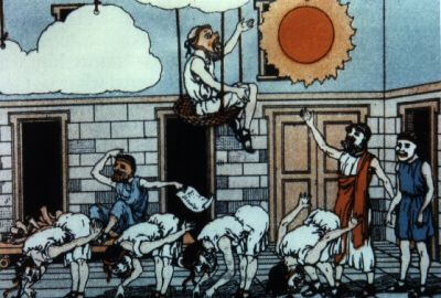 Socrates here is another common comic character: the foolish wise man. He shows a vast knowledge of generally useless things and a deep irreverence for any other ideologies. This is hilarious precisely for the academic intolerance and the thoroughly unsupported assertions that any person with a modicum of education can identify as ludicrous. In many ways this reinforces Pheidippides' new character by showing how weak the veneer of the sophisticate is. Socrates is not displayed with any of the rounded features of his actual life. Instead he is an incredibly flat blocking figure representing everything wrong in Athenian education. Strepsiades starts as a very flat debtor looking to use cleverness to escape his debts but becomes more rounded as he learns the price of Socrates' teachings late in the play and decides to burn the Pondertorium. |