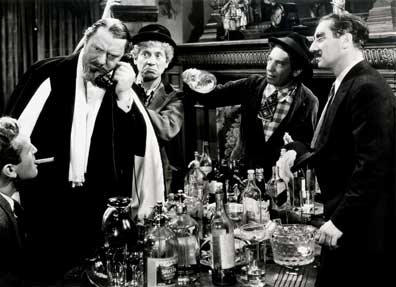 A Night at the OperaIn the 1935 movie A Night at the Opera, starring the Marx Brothers, a basic romance plot is contrived in order to give an excuse for the Marx Brothers to make jokes and be in funny situations. The opening scene introduces the character of Otis Driftwood (Groucho Marx) and puts him in contrast with the aristocratic opera world and the wealthy Mrs. Claypool (Margaret Dumont). Mr. Driftwood is interested in Mrs. Claypool's money and tries to convince her to marry him. Driftwood's motivations throughout the movie center around acquiring money. This single-minded drive for money is why he initially seeks out 'the greatest tenor in the world,' and makes it part of his mission to bring Ricardo Baroni (Allan Jones) to America and into the New York Opera. In this sense Driftwood is a lot like the Aristophanic comic hero Makemedo, for it is his selfish drive that advances the plot.
